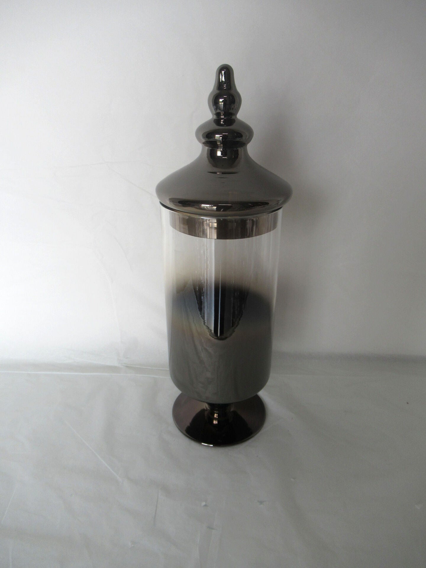 Den røgfarvede glasfinish giver et moderne og sofistikeret look, mens låget med dekorativ knop og den klassiske fod tilfører et eksklusivt præg.