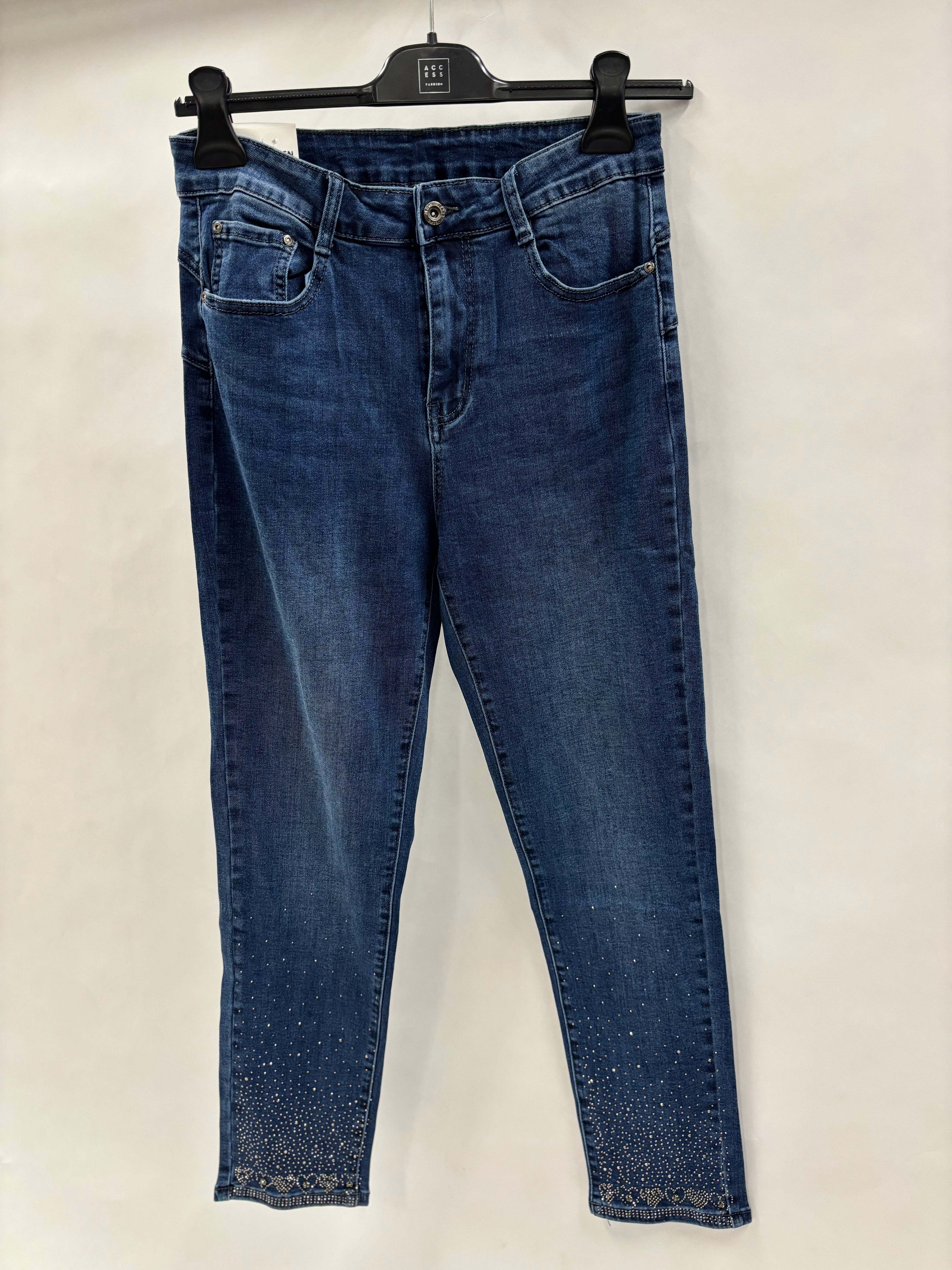 Den robuste denim sikrer en flot pasform og høj komfort, mens de glitrende detaljer ved benafslutningen giver bukserne et elegant og feminint finish. Ideelle til både hverdagsbrug og festlige anledninger.