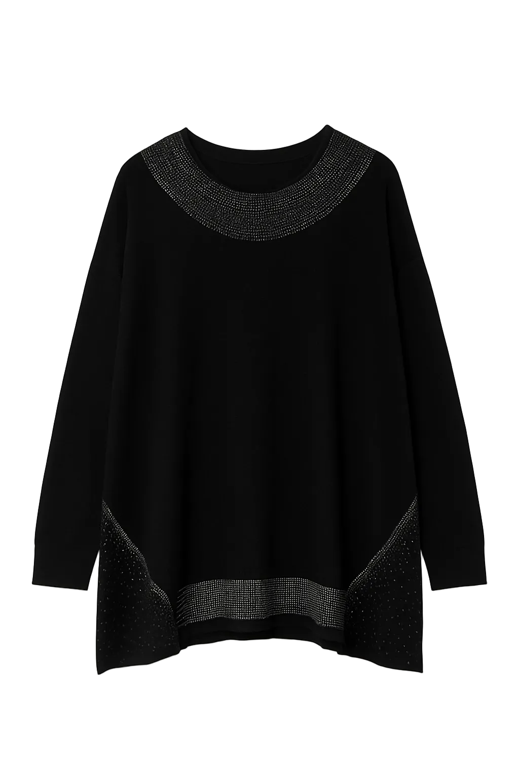 Forkæl din garderobe med denne luksuriøse strikbluse, der kombinerer komfort og glamour på den mest elegante måde. Blusen er udsmykket med glimtende sten både langs halsudskæringen og i bunden af blusen, hvilket giver et sofistikeret og eksklusivt udtryk, der skiller sig ud.